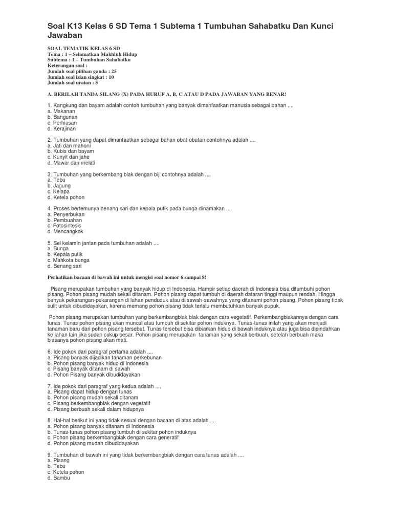 Soal K13 Kelas 6 Sd Tema 1 Subtema 1 Tumbuhan Sahabatku Dan Kunci Jawaban